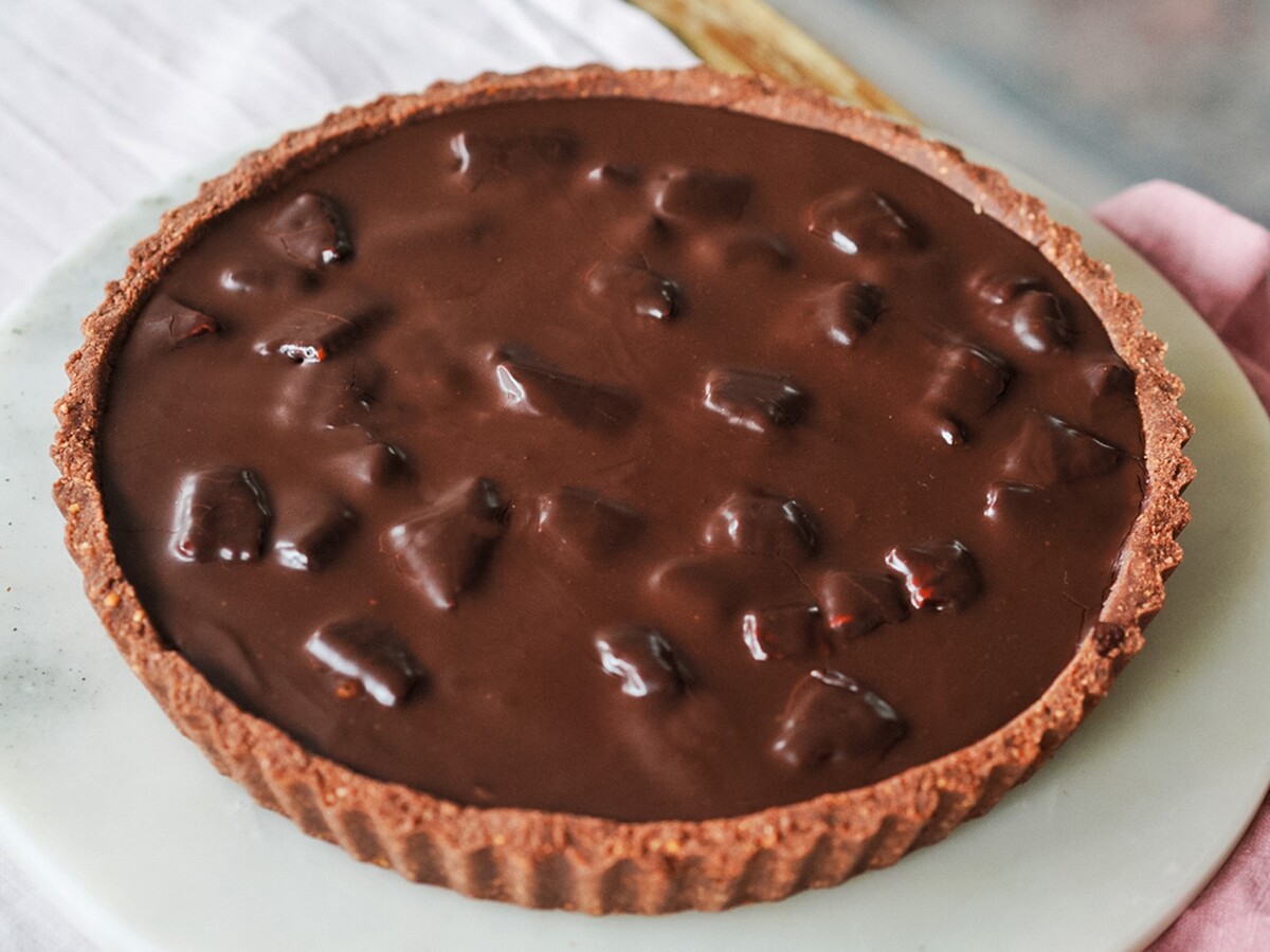 La final, am aranjat cu o spatulă ciocolata, ca să fie uniform distribuită peste tartă și am lovit puțin forma de tartă, ca să iasă aerul prins de ciocolată.