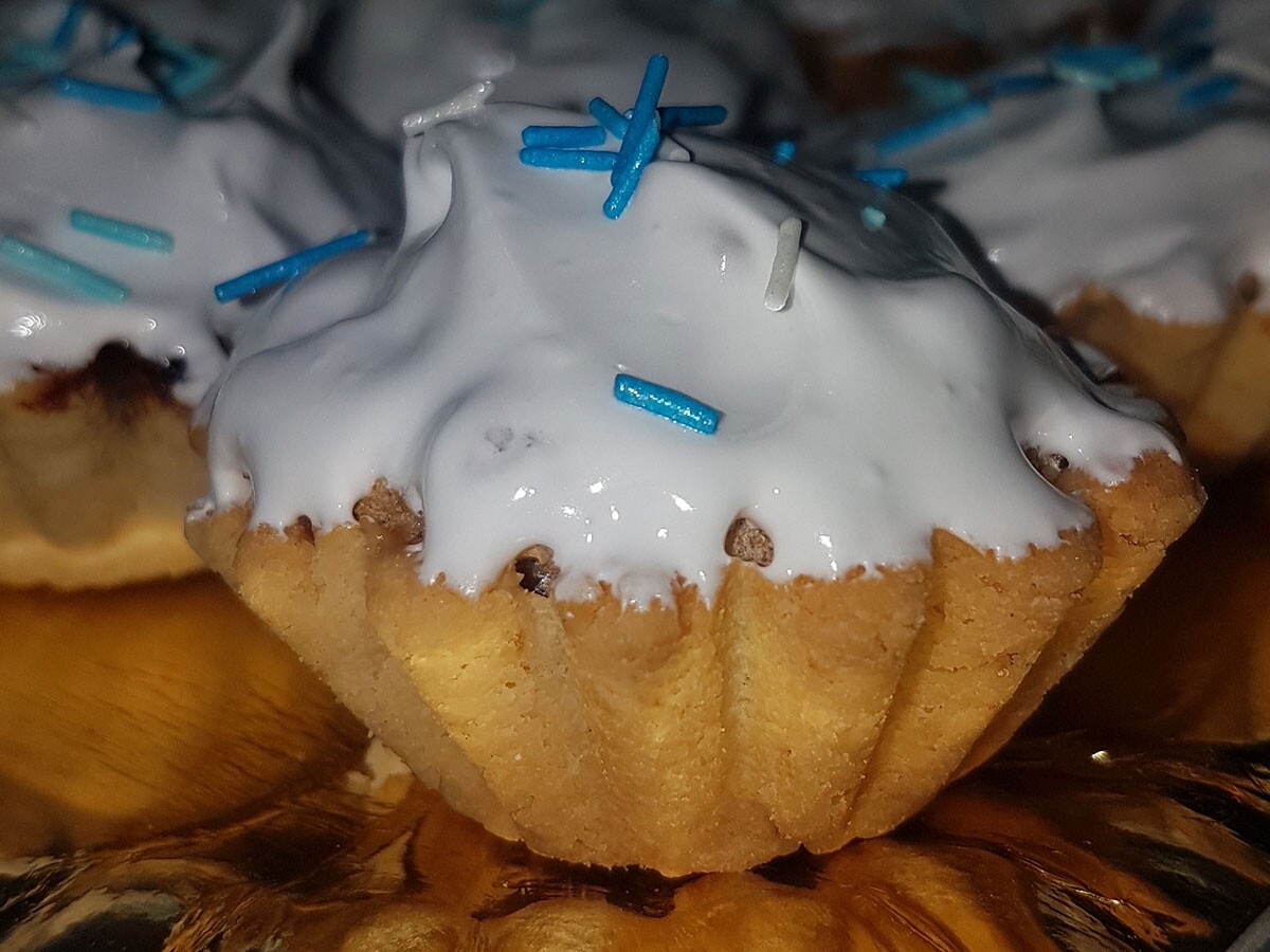 Se amestecă bine gălbenuşurile cu zahărul pudră, apoi se adaugă laptele, untul moale, uleiul, praful de copt. Se amestecă bine toate apoi se încorporează făina și se frământă bine până când aluatul nu se mai lipeşte de mână. Se lasă la odihnit 30 min timp în care ungem formele cu ulei (eu prefer untura de porc). Apoi facem biluțe de apox 40 g fiecare și le așezăm în forme, apăsăm bine pe biluță ca să acopere forma uniform până la margini. Apoi se pune câte o linguriţă de dulceaţă de vişine în fiecare formă peste aluatul întins. Peste dulceaţă adăugăm bezeaua bătută cu zahărul și nuca -1 lingură din compoziție la fiecare formă.