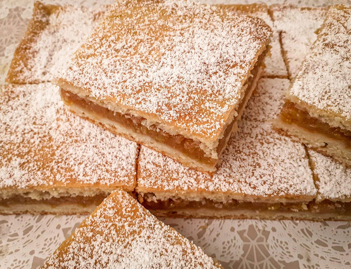 Se întinde prima foaie se adaugă un strat de mere după care a doua foaie şi strat de mere. La final se înţeapă cu furculiţa de colo colo ca să avem o foaie uniformă. După ce e gata asamblată se coace la 160 de grade. Se adaugă zahăr pudră deasupra.