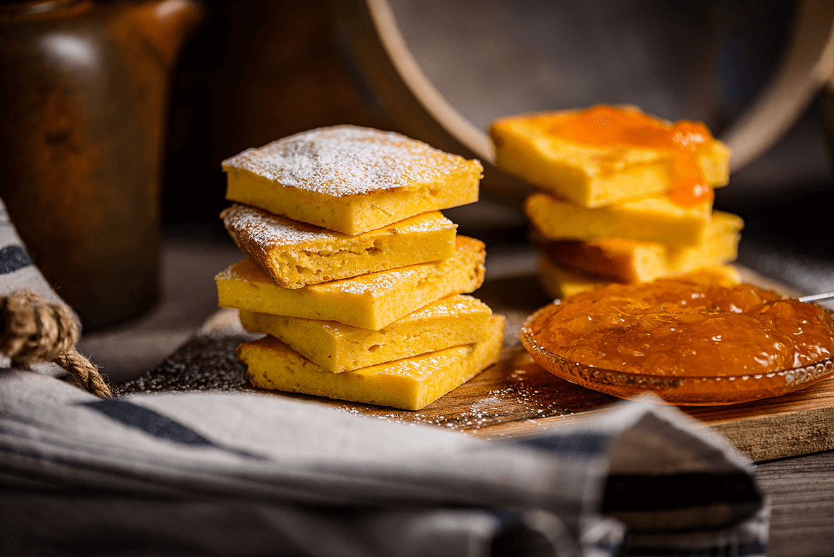 Se toarnă compoziția într-o tavă de 18x18cm (tapetată cu foaie de copt sau dată cu unt și făină) și se coace jumătate de oră sau până se rumenește ori până la proba scobitorii. Se scoate și se taie cât e caldă în pătrate care se servesc fierbinți cu smântână, zice Sanda Marin. Noi am pus și o dulceață acrișoară de caise lângă și a fost minunat!
