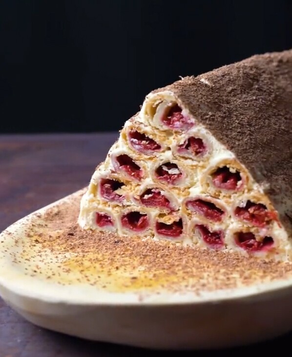 Odată ce sunt parcurși acești pași, aluatul poate fi împărțit în trei părți egale peste care se presară făină pentru a se întinde. Din fiecare cele trei foi obținute trebuie create alte cinci foi mai mici, pe care se așază vișinele și se rulează cu grijă. În total trebuie obținute 15 astfel de rulouri cu vișine. Acestea se transferă pe o tavă și se introduc în cuptor la 180 de grade, pentru 20 de minute.
