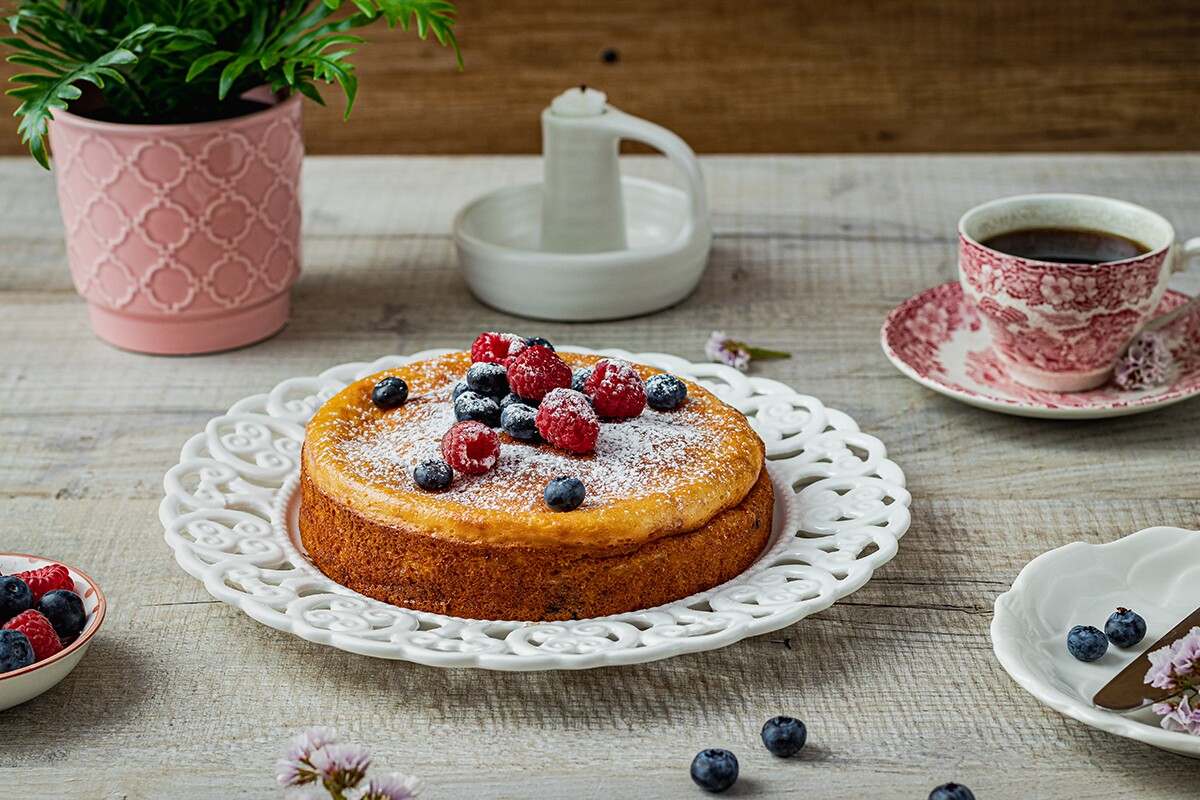 La final se lasă să se răcească, se pudrează cu puțin zahăr pudră, se decorează cu fructe proaspete, după preferințe și se taie bucăți.