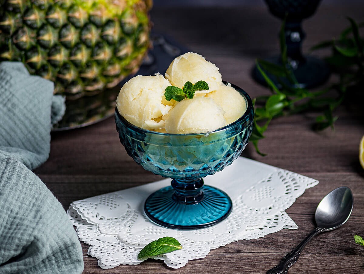 Ananasul se mărunţește la blender cât de fin posibil. Ionin ne spune să strecurăm prin sită “apăsând cu lopățica cât să treacă și carnea ananasului”. Se amestecă cele două compoziții și se pune în șerbetieră, zice Ionin mai departe. Noi am pus în caserolă cu capac, am dat la congelator și am mai amestecat din când în când ca să nu facă ace de gheață.