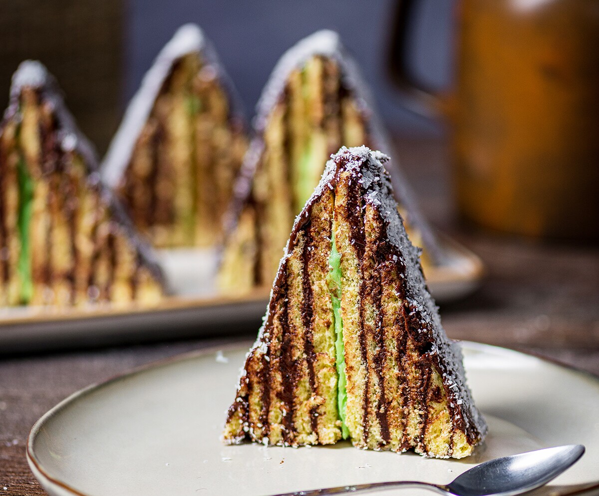 Lipiți cele două bucăți spate în spate (pe latura cea mai mare) cu crema rămasă. Prăjitura începe să arate ca un munte/triunghi! Dacă vreți să respectați convenția și să puneți și crema verde puteți freca puțin unt cu colorant verde și zahăr pudră și să uniți cele două bucăți cu crema rezultată.