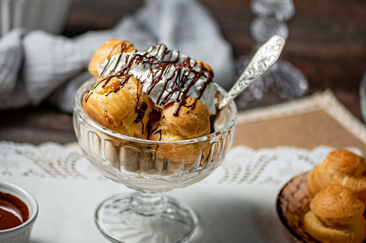 Umpleți gogoșelele cu cremă printr-un orificiu făcut cu duiul sau un vârf de cuțit la baza lor. Puneți în cupe cu picior un strat de frișcă, o cupă de înghețată, câteva choux-uri și decorați cu ciocolată topită.
