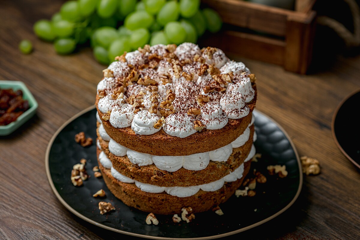 25 minuteAlbușurile se bat spumă tare adăugând treptat zahărul și zeama de lămâie. Se adaugă stafidele (în prealabil macerate în 20 ml rom, timp de 2 ore) împreună cu romul rămas, pesmetul și cele două tipuri de nuci (care pot fi coapte în prealabil, pentru extra gust).